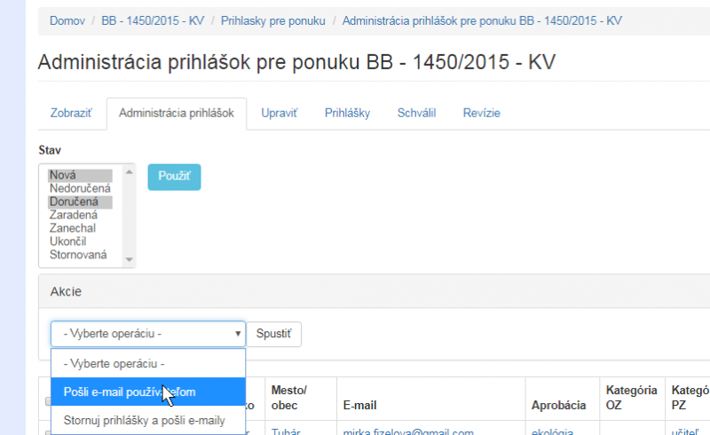 Možnosti stornovania a posielania hromadných mailov nájdete v "Administrácii prihlášok" - je súčasťou každej ponuky - ponuku je potrebné otvoriť - zobraziť.